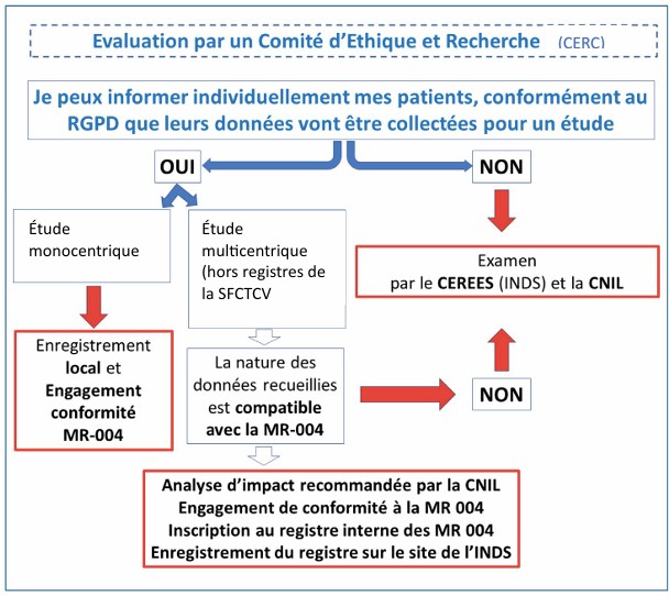 c. 📝 Autorisation de recherche auprès de l’INDS (Institut National des Données de Santé), avec avis du CESREES (Comité éthique et scientifique pour les recherches, les études et les évaluations dans le domaine de la santé) puis transmission de la demande d’autorisation à la CNIL (Commission National Informatique et Libertés). ℹ️Pour les études hors bases de données de la SFCTCV.